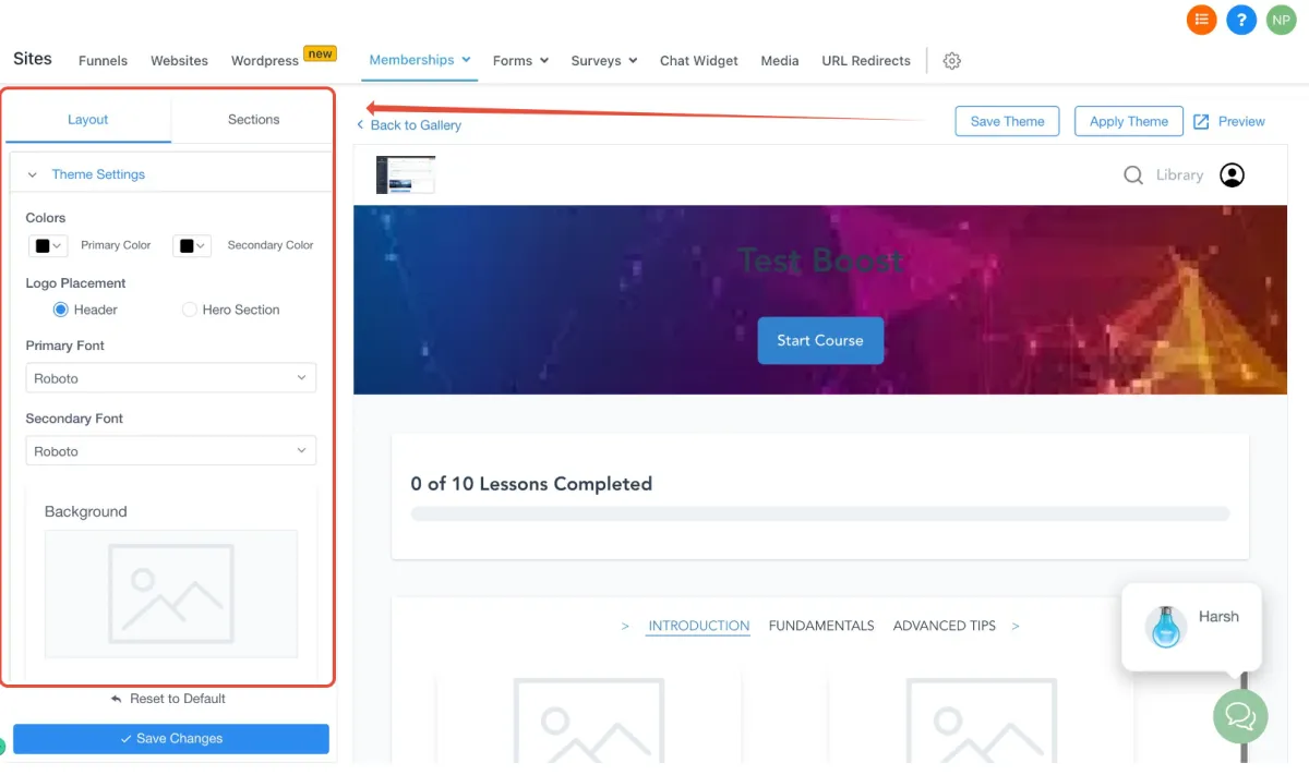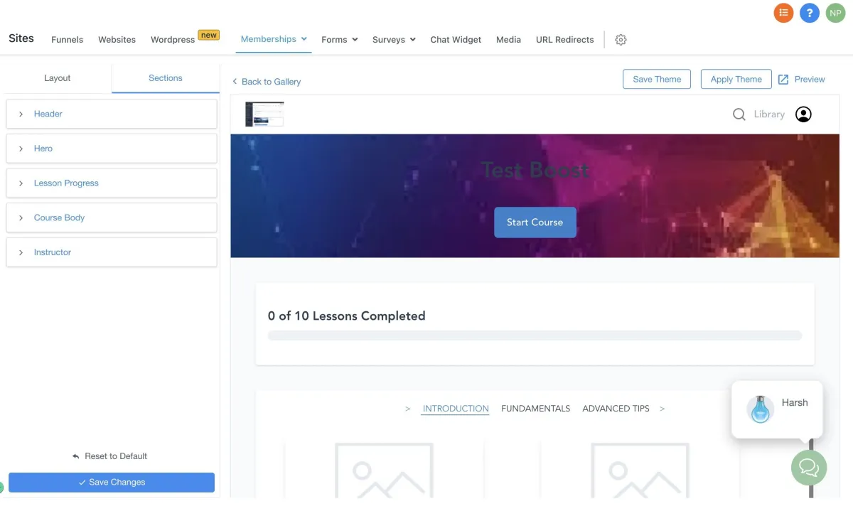 Seiten->Mitgliedschaft->Produkte->Anpassen->Galerie>Anpassen->Abschnitte-> Lektionsfortschritt
