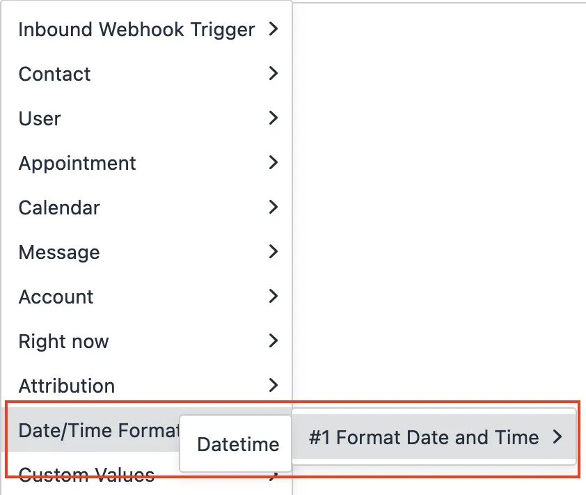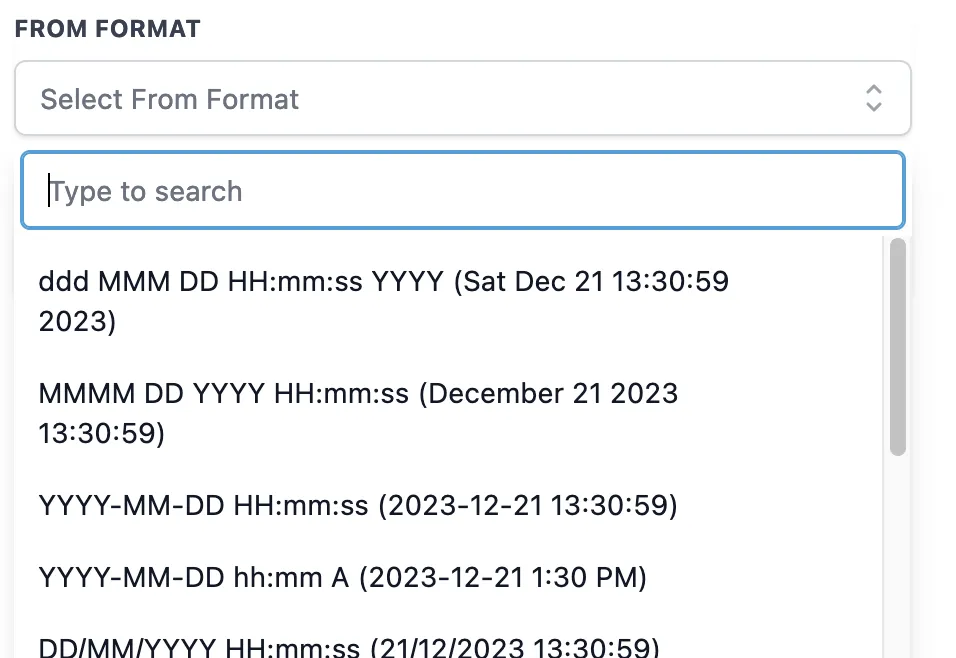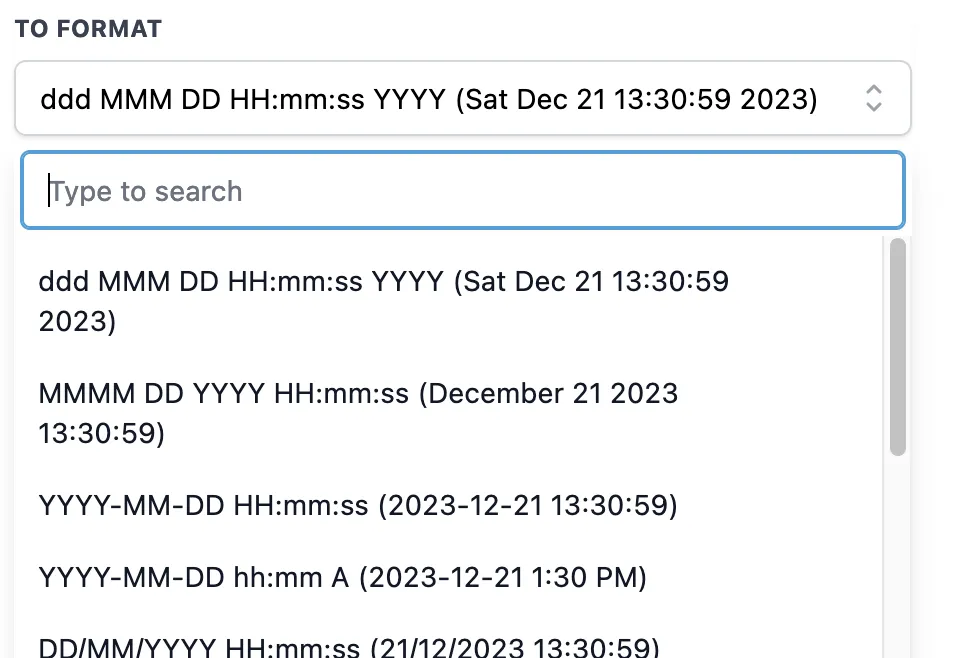 Das Tool erkennt automatisch das Format und wählt es vor, wenn Sie ein Systemfeld wie Bestimmtes Datum und Uhrzeit, Aktuelles Datum und Uhrzeit oder Start-/Enddatum und -uhrzeit eines Termins auswählen. Wenn Sie einen Benutzerdefinierten Wert oder einen Eingehenden Webhook-Auslöser wählen, müssen Sie das passende Format manuell auswählen.
