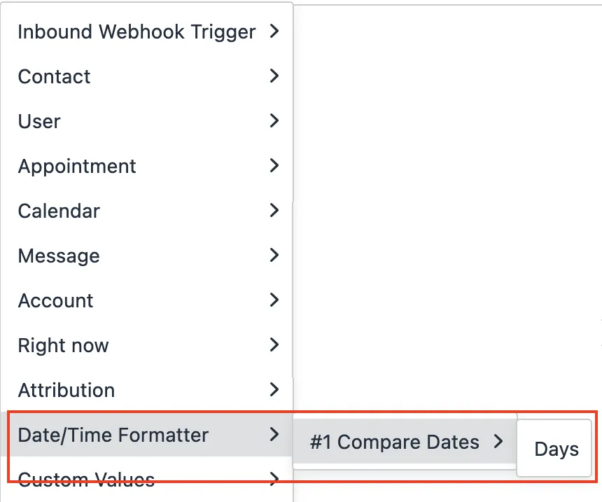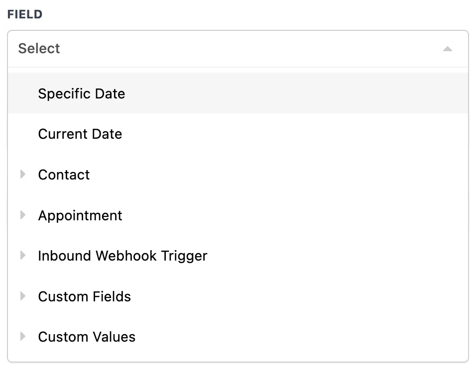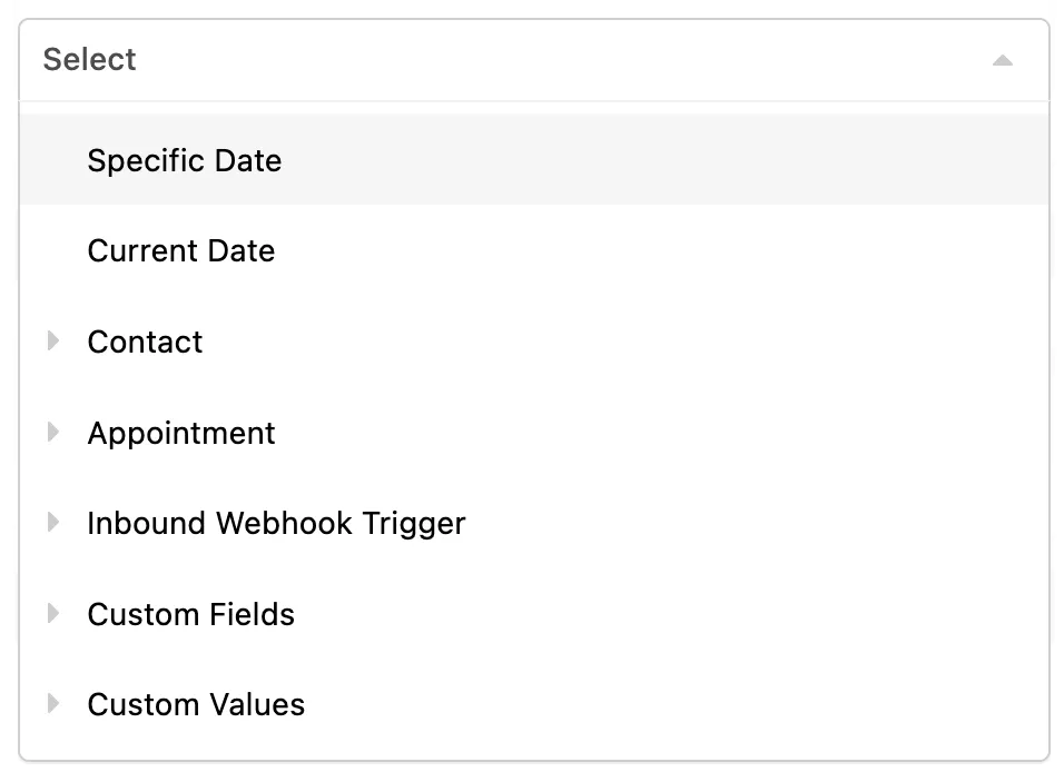 Wählen Sie das Datumsfeld aus, das Sie neu formatieren möchten. Sie können verschiedene Quellen auswählen, wie ein bestimmtes Datum, das aktuelle Datum, Datumsfelder eines Kontakts, Datentyp benutzerdefinierte Felder, Anfangs-/Enddatum eines Termins, benutzerdefinierte Werte oder sogar von einem eingehenden Webhook-Trigger.