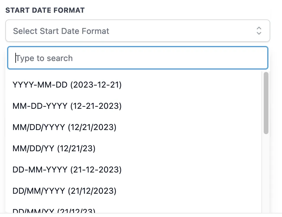 Wenn Sie ein Systemfeld wie Spezifisches Datum, Aktuelles Datum, Datumstyp-Felder (Standard oder benutzerdefiniert) des Kontakts oder Start-/Enddatum eines Termins auswählen, erkennt das Tool das Format automatisch und wählt es vorab aus. Sie müssen das passende Format manuell auswählen, wenn Sie einen Benutzerdefinierten Wert oder einen Eingehenden Webhook-Auslöser wählen.