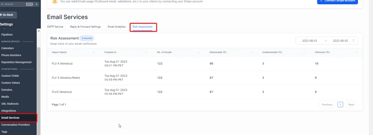 Auf der Registerkarte „Risikobewertung“ unter „Einstellungen“ > „E-Mail-Dienste“ > „Risikobewertung“ werden historische Daten für die Importe in Bezug auf die Risikobewertung von E-Mail-Adressen verfolgt.