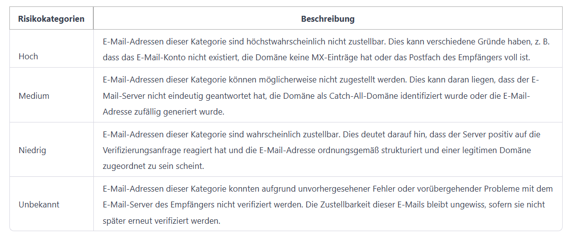 Aus verschiedenen Gründen, z. B. aufgrund von Servereinschränkungen, Datenschutzeinstellungen oder Netzwerkproblemen, können nicht alle E-Mail-Adressen verifiziert werden. Diese E-Mail-Adressen werden als „Unbekannt“ kategorisiert.