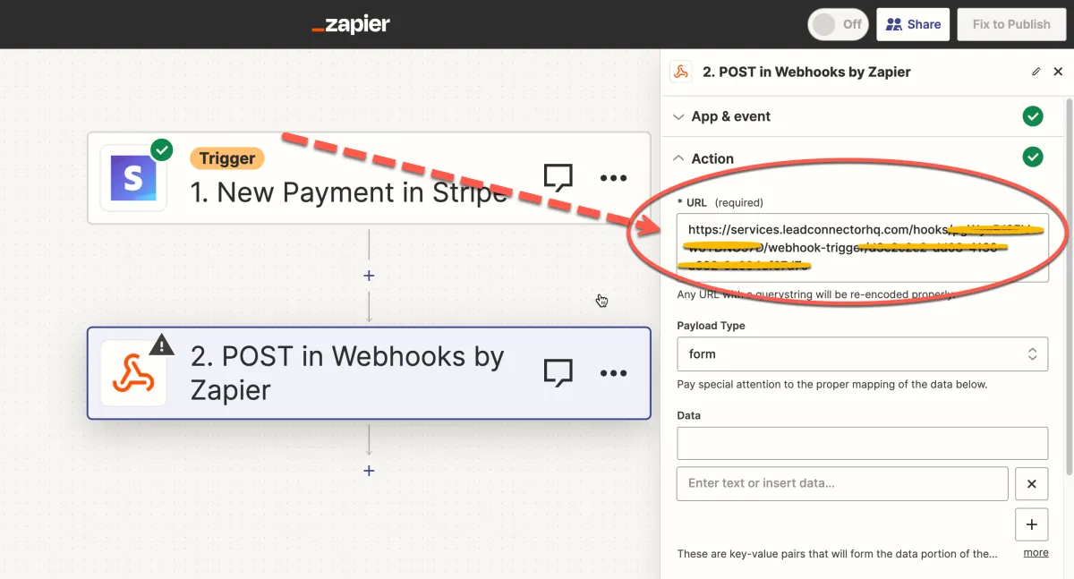 In der externen Anwendung Ihrer Wahl müssen Sie einen Auslöser und einen Webhook-Aktionsschritt erstellen. Zum Beispiel: In Zapier können Sie einen "Payment"-Auslöser verwenden, der ausgelöst wird, wenn eine Zahlung getätigt wird. Wir können den