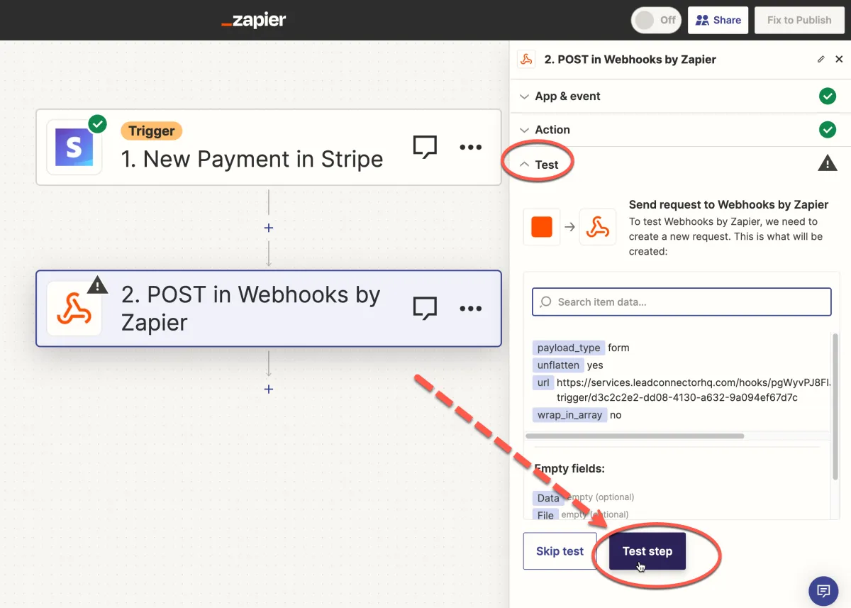 Jetzt müssen wir eine Beispiel-Nutzlast an unsere Pilotly-Webhook-URL senden, um fortfahren zu können. Gehen Sie innerhalb Ihrer externen App, in diesem Beispiel Zapier, zum Ende des Schritts und klicken Sie auf "Test Step". Um einen Test-Payload in Pilotly für eine externe App zu senden, konsultieren Sie bitte die Dokumentation Ihrer externen App und den Support. Warten Sie in Pilotly weiter und aktualisieren Sie den Abschnitt "Mapping Reference", bis Sie eine "Mapping Reference" in Pilotly zur Auswahl haben.