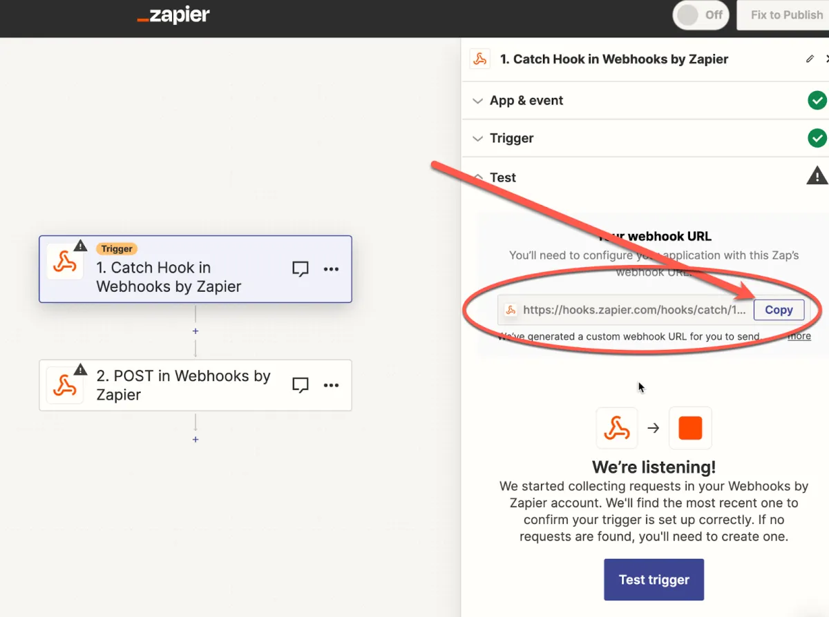 Erstellen Sie in Ihrer externen App einen Trigger für den Inbound Webhook. Nachdem Sie diesen Trigger erstellt haben, sollten Sie eine Webhook-URL generiert haben, die Sie in späteren Schritten verwenden können. Ein Beispiel: In Zapier können Sie den Trigger "Webhooks von Zapier" mit dem Ereignis "Catch Hook" verwenden. Fahren Sie mit dem Schritt "Trigger" fort. Kopieren Sie die von der externen App generierte Webhook-URL.