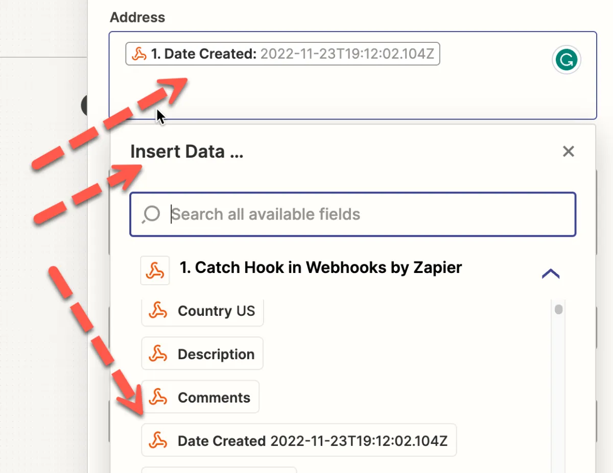 Wählen Sie ein Feld aus, das Sie in Ihrer Zapier-Aktion aktualisieren möchten. In einem Popup-Fenster wird die Option "Daten einfügen" angezeigt, mit der Sie einen Platzhalter (oder einen benutzerdefinierten Wert, wie er in Pilotly bekannt ist) innerhalb der Zapier-Aktion auswählen können, um die Informationen in der Nutzlast zuzuordnen. Dadurch werden die gewünschten Daten bei jedem Durchlauf dieses Webhooks gestempelt, so dass die richtigen Informationen aus Pilotly an den richtigen Stellen in Zapier oder Ihrer anderen Drittanbieter-App aktualisiert werden.