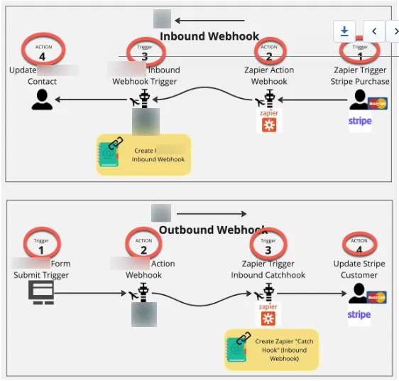 Ein weiterer hilfreicher Weg, um etwas über Webhooks zu lernen, besteht darin, das Muster in der Reihenfolge der auftretenden Vorgänge zu erkennen. Unabhängig davon, ob es sich um einen eingehenden oder ausgehenden Webhook handelt, haben wir im Allgemeinen einen Trigger und eine Aktion in einer Anwendung, die dann Informationen an eine andere Anwendung sendet. In dieser zweiten Anwendung gibt es einen weiteren Auslöser und dann die letzte Aktion.