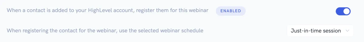 Hier sehen Sie einen Umschaltknopf. Klicken Sie auf den Umschaltknopf, um diese Funktion zu aktivieren. Wenn die Funktion aktiviert ist, sehen Sie auch einen Dropdown-Menü, in dem Sie einen Webinar-Zeitplan auswählen können. Dies ist wichtig, da dies die Präsentationszeit des Webinars bestimmt, für das Ihre neuen pilotly.io-Kontakte registriert werden.