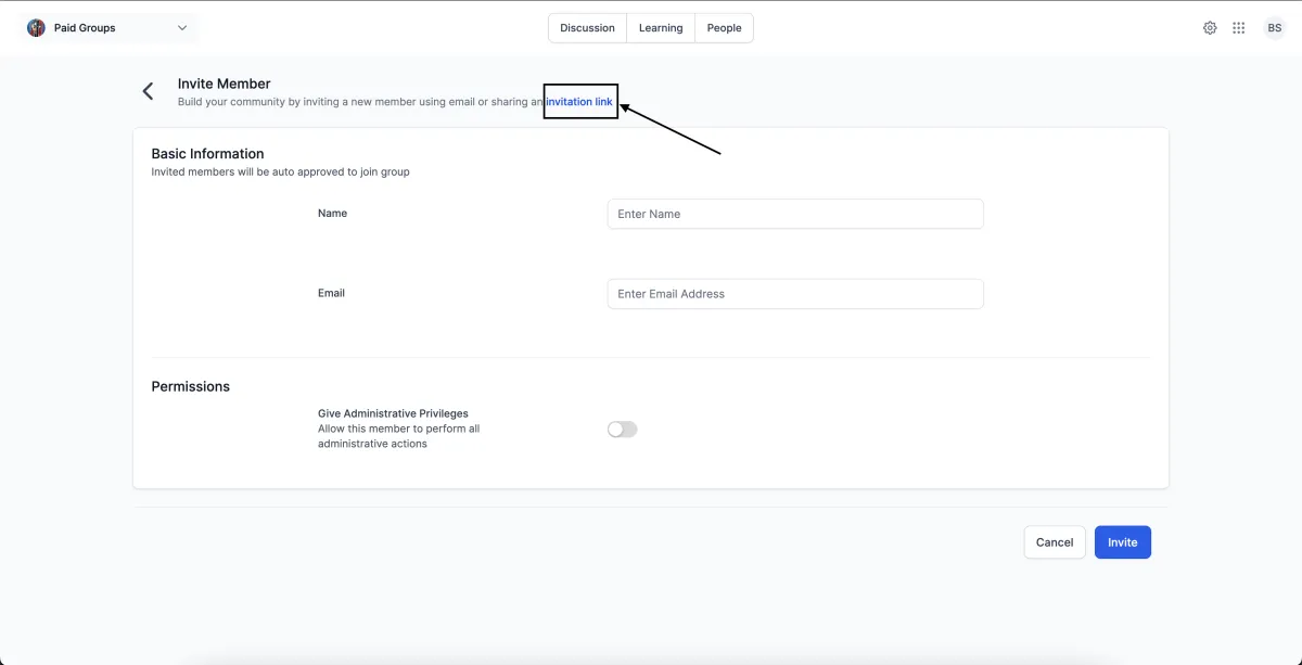 Administratoren und Eigentümer haben jetzt die Möglichkeit, einzigartige Einladungslinks auf der Einladungsseite zu erstellen. Befolgen Sie diese Schritte, um einen Einladungslink zu erstellen: