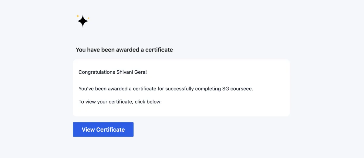 Wir präsentieren unsere brandneue Funktion: Zertifikate, die in Kurse integriert sind! Diese Verbesserung ermöglicht es Standortnutzern, personalisierte Zertifikate für den Kursabschluss zu versenden. Lernende erhalten E-Mail-Benachrichtigungen mit Links zum Zugriff und Download ihrer Zertifikate. Es ist eine fantastische Möglichkeit, die Leistungen Ihrer Lernenden anzuerkennen und zu feiern.
