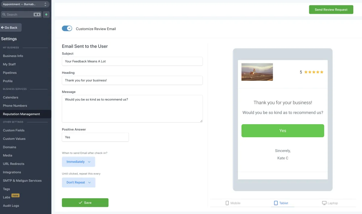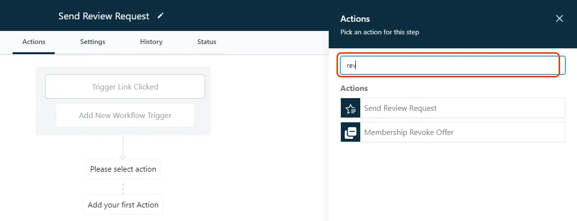 Wenn Sie eine Bewertungsanfrage von den zugewiesenen Kontakten senden möchten, verwenden Sie bitte die Workflows-Aktion "Bewertungsanfrage senden", um im Namen des zugewiesenen Benutzers eine Anfrage zu senden.