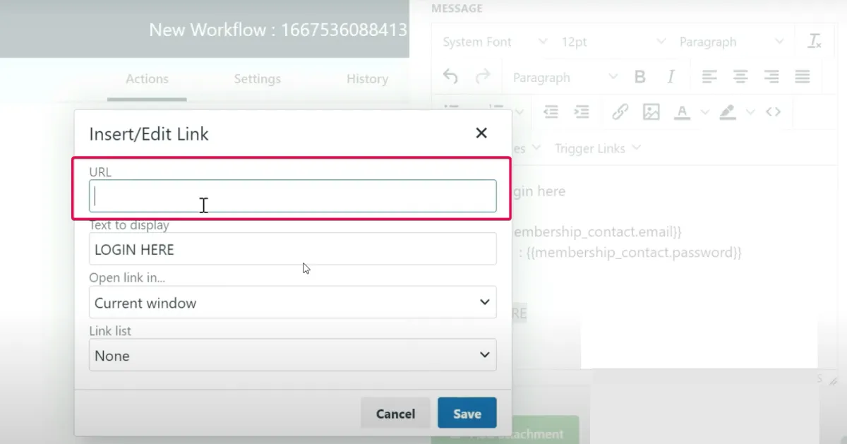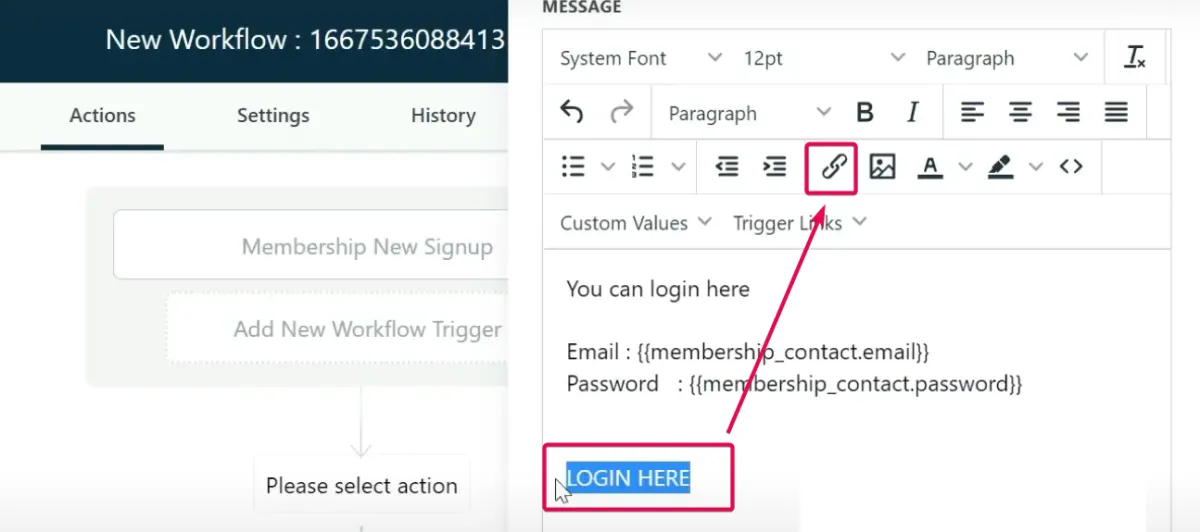Gehen Sie dann zur E-Mail-Vorlage Ihres Mitgliedschafts-Workflows oder zur Mitgliedschaftsvorlage des E-Mail-Builders und fügen Sie den magischen Link entweder so ein, wie er ist, in den Nachrichtentext. Oder markieren Sie einige Wörter, auf die die Leute klicken sollen, und verknüpfen Sie sie mit dem magischen Link.