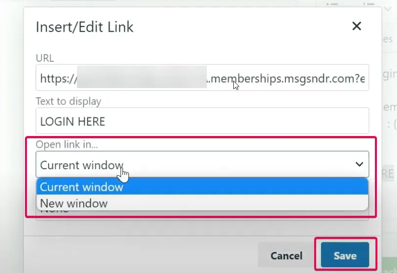 Wählen Sie in der Dropdown-Liste "Link öffnen in", ob der magische Link das Mitgliedschaftsportal im aktuellen oder in einem neuen Fenster öffnen soll. Klicken Sie dann auf Speichern.