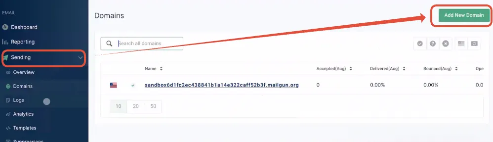 3. Loggen Sie sich bei Mailgun ein, klicken Sie auf Senden > Neuen Domain hinzufügen