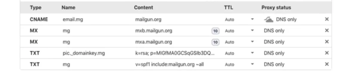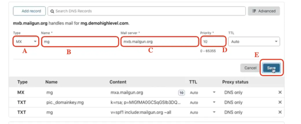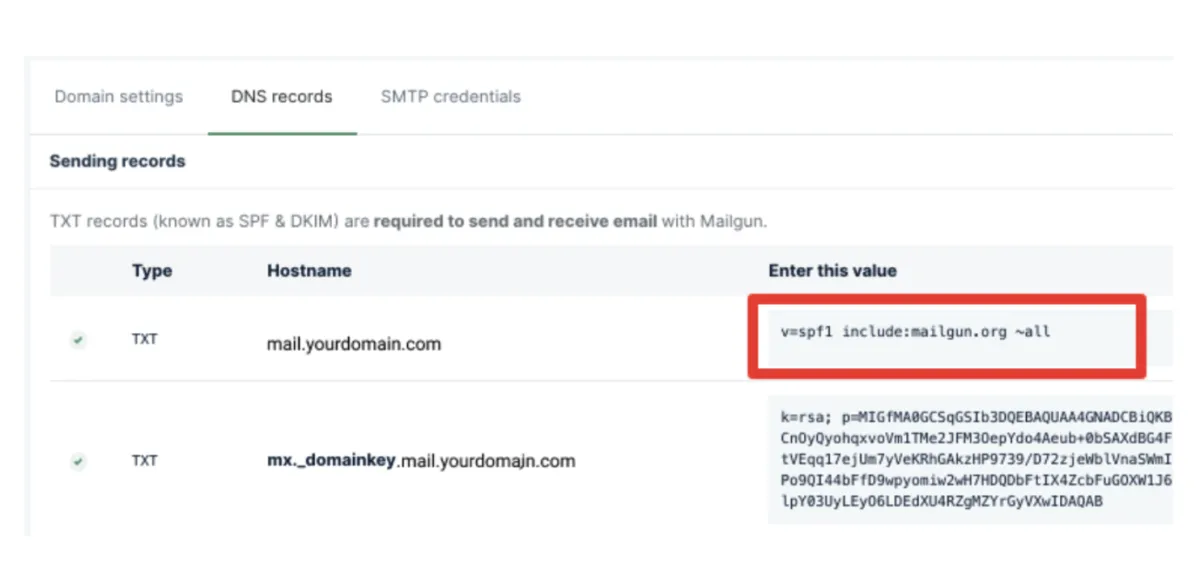 C. Inhalt: Gehen Sie zurück zu Mailgun und kopieren Sie den zweiten TXT-Eintrag, der im Screenshot unten hervorgehoben ist
