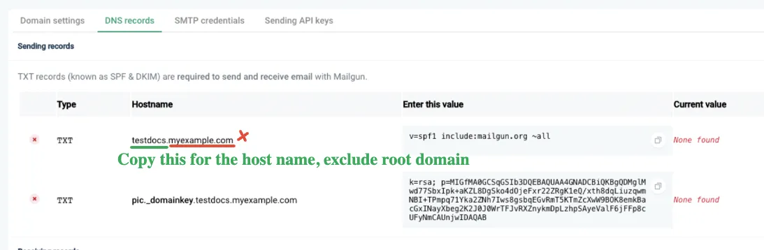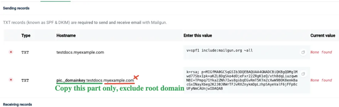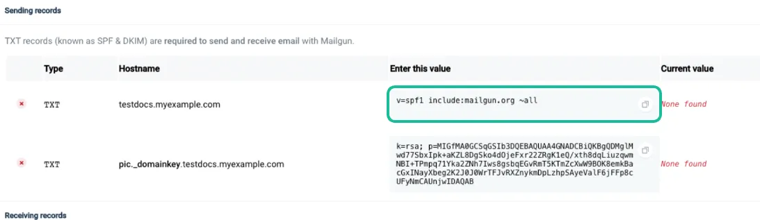 C. TXT-Wert: Gehen Sie zurück zu Mailgun und kopieren Sie den zweiten TXT-Eintrag hier, der in dem untenstehenden Screenshot hervorgehoben ist.