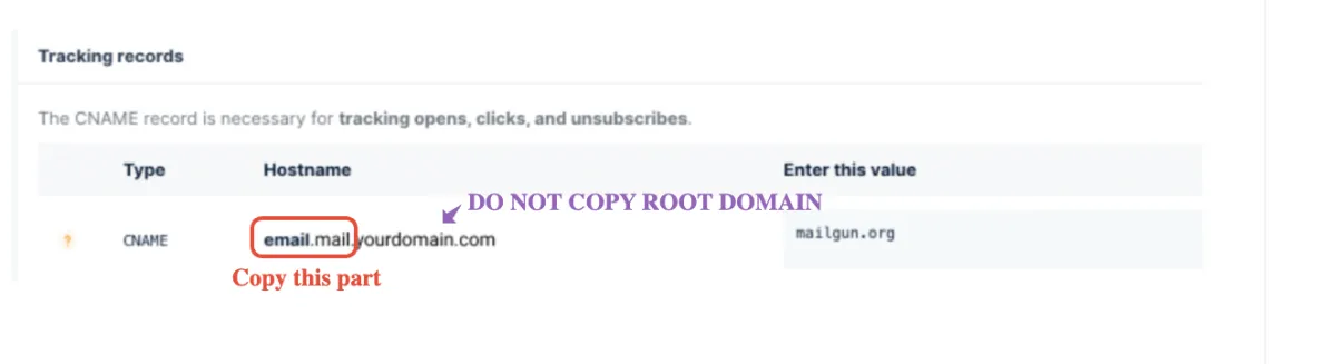 Gehen Sie zurück zu Mailgun, um den Hostnamen zu kopieren. Es ist etwas knifflig, aber der Schlüssel hier ist, alles von Anfang bis zum Subdomain-Teil zu kopieren. Kopieren Sie NICHT die Hauptdomäne.