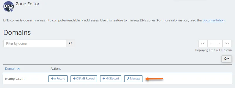 3. Auf der nächsten Seite suchen Sie Ihren Domain-Namen im Bereich "Zone Editor" und klicken dann auf die Schaltfläche "Verwalten".