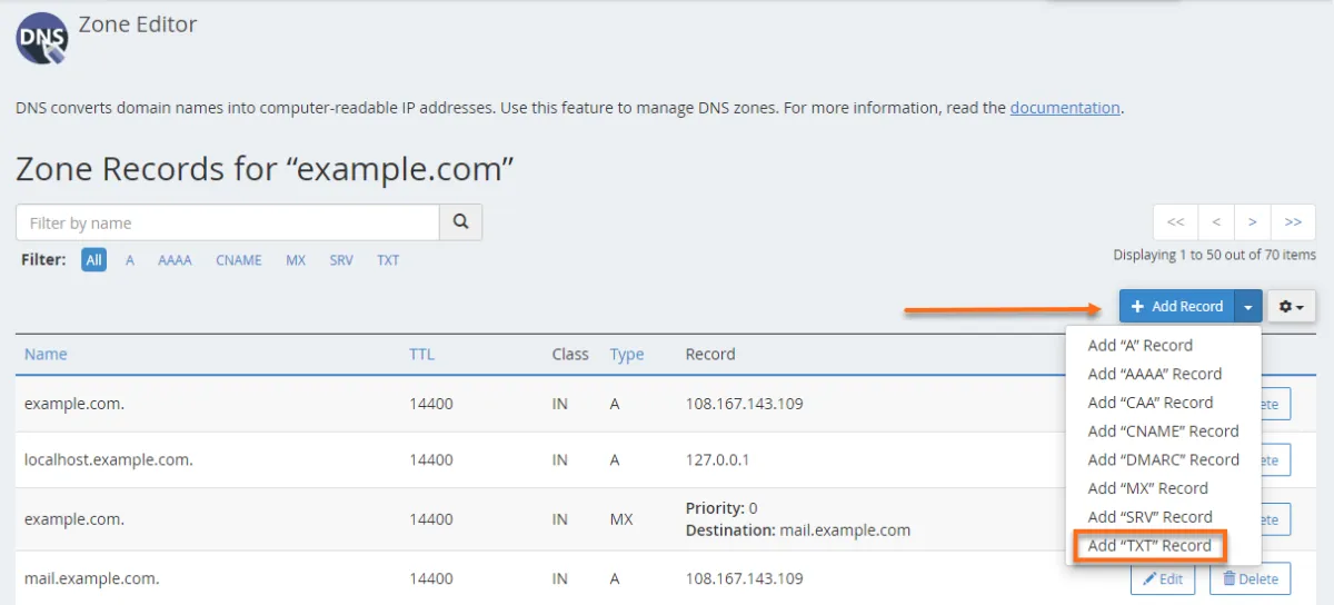 5. Klicken Sie auf die Schaltfläche +Eintrag hinzufügen und wählen Sie "TXT-Eintrag hinzufügen"