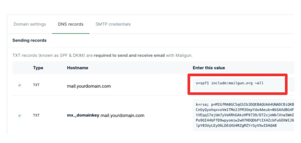 Gehen Sie zurück zu Mailgun und kopieren Sie den 2. TXT-Eintrag, der unten im Screenshot hervorgehoben ist.