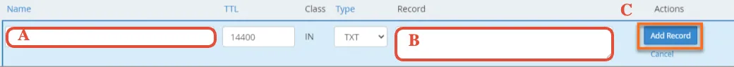 Klicken Sie auf die Schaltfläche +Datensatz hinzufügen und wählen Sie erneut "TXT-Datensatz hinzufügen"