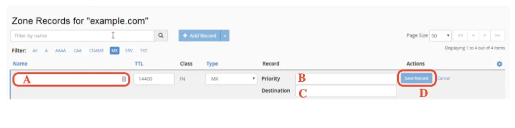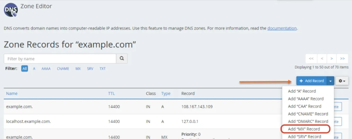Klicken Sie auf die Schaltfläche +Datensatz hinzufügen und wählen Sie "MX"-Datensatz hinzufügen
