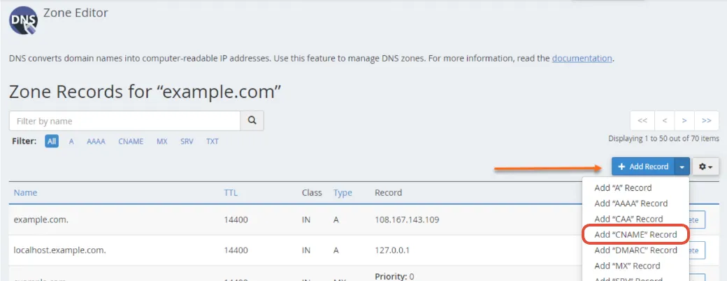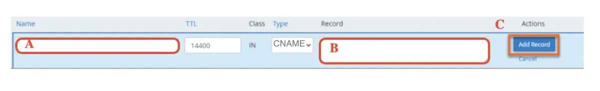 Klicken Sie auf die Schaltfläche +Datensatz hinzufügen und wählen Sie "CNAME"-Datensatz hinzufügen