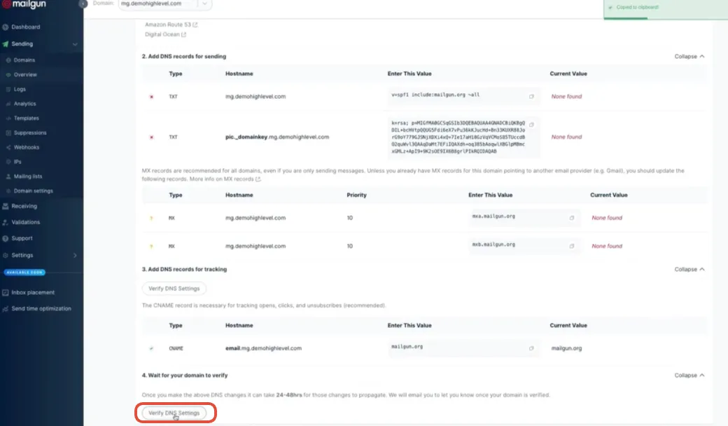 Nachdem Sie 5 Einträge hinzugefügt haben, gehen Sie zurück zu Mailgun und klicken Sie auf DNS-Einstellungen überprüfen