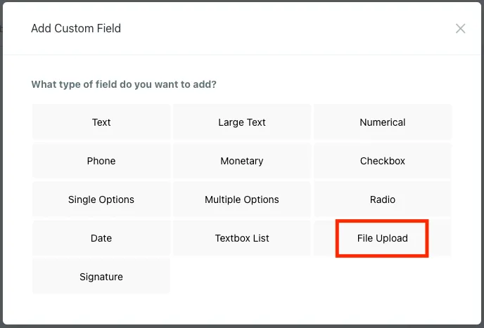 Dateien können in Formularen und Umfragen durch Hinzufügen von benutzerdefinierten Feldern hochgeladen werden.