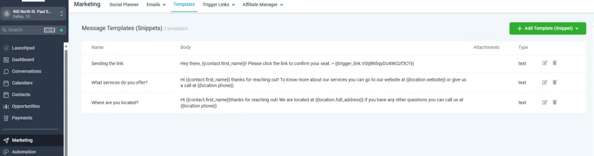 1. Nachdem Sie sich in den Standort/Sub-Account eingeloggt haben, klicken Sie auf Marketing>Vorlagen.