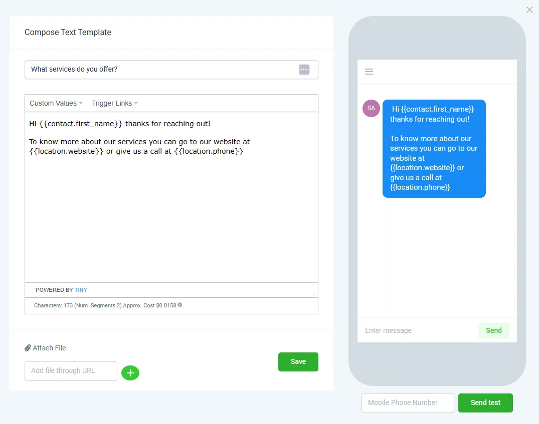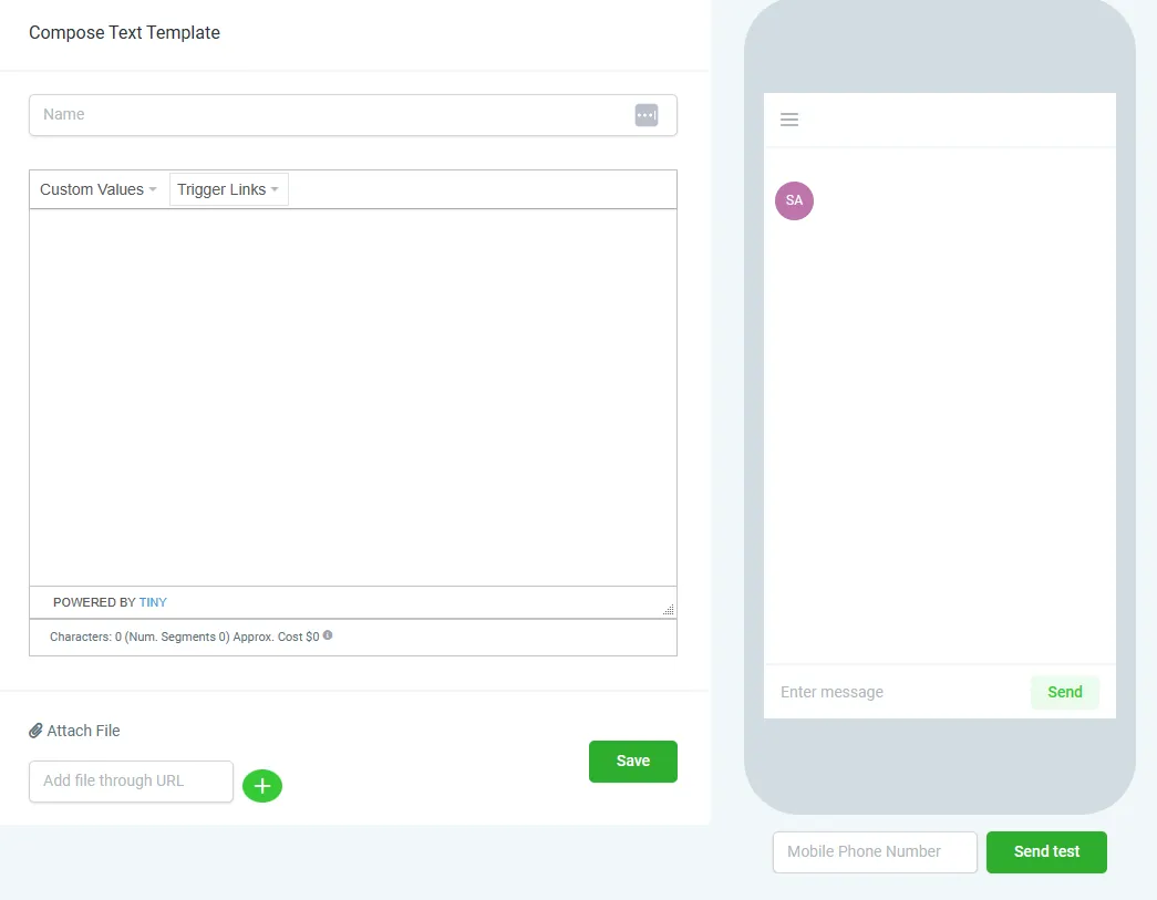 4. Verfassen Sie Ihren Snippet unter Verwendung von benutzerdefinierten Werten und Trigger-Links, falls nötig. Die Vorschau auf der rechten Seite zeigt Ihnen, wie es als SMS-Nachricht auf dem Telefon aussehen würde.