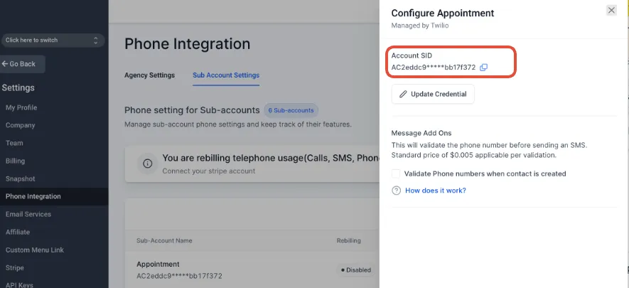 Sie können die Account SID in den Agentureinstellungen > Telefonintegrationseite finden >