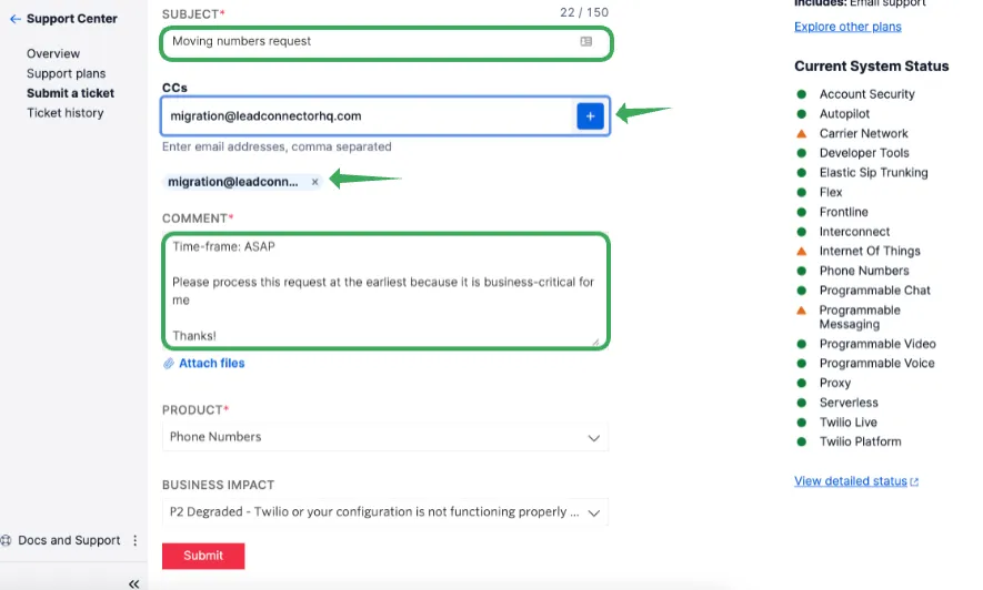 Twilio-Telefonnummern können vom Twilio Support-Team problemlos zwischen verschiedenen Projekten übertragen werden. Um diese Änderung anzufordern, sammeln Sie bitte folgende Informationen.: