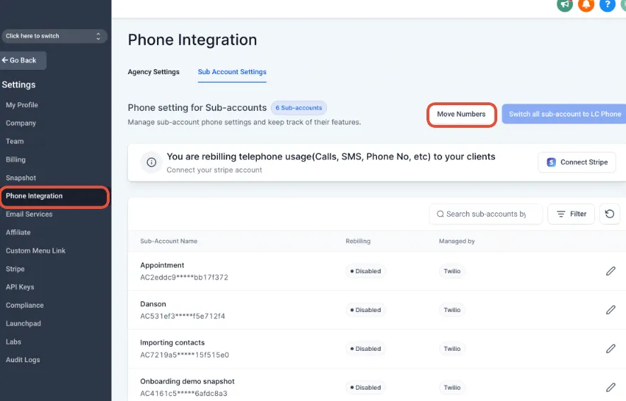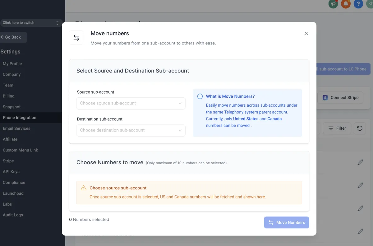 Wenn beide Unter-Konten LC Phone verwenden und das Werkzeug nicht funktioniert, kontaktieren Sie bitte den Pilotly-Support.Um die Zahlen für Sie zu verschieben, geben Sie die Standort-ID der Zahlen an, die Sie verschieben möchten