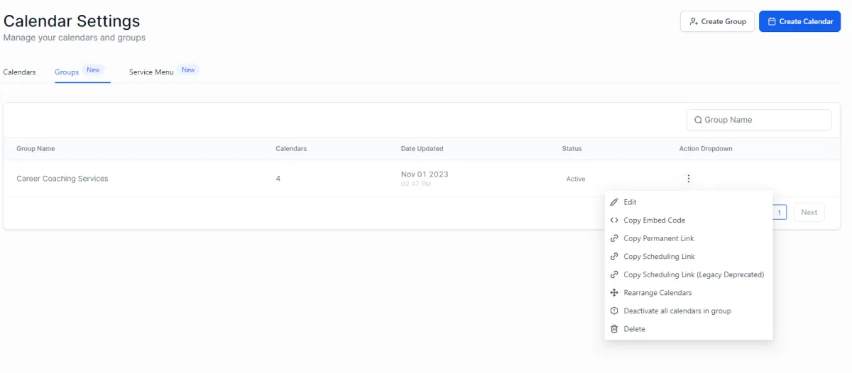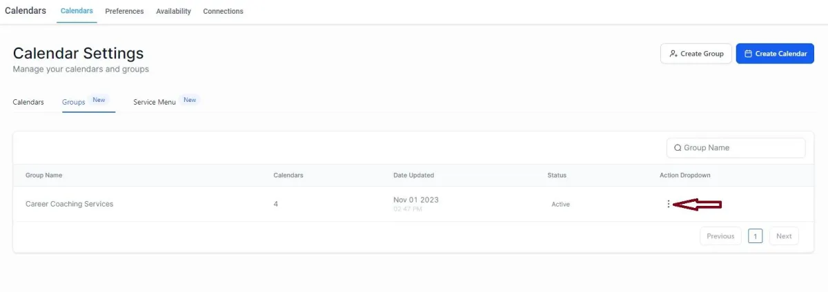 Um das zu tun, gehen Sie zu den Kalendereinstellungen und klicken Sie auf "Gruppen". Suchen Sie den Gruppenkalender, den Sie möchten, und klicken Sie auf die 3 Punkte, die dem Aktions-Dropdown-Menü entsprechen.