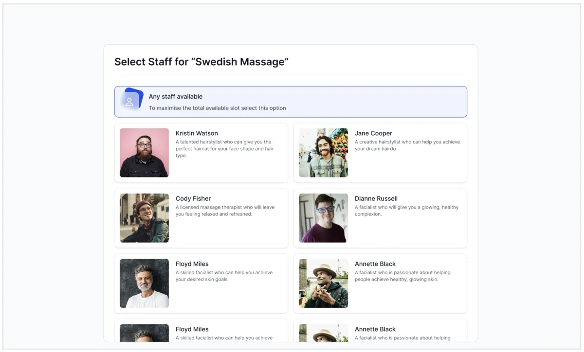 Mitarbeiterauswahl:Neue verbesserte Erfahrung für die Mitarbeiterauswahl für einen bestimmten Service. Wenn der Kalender die Mitarbeiterauswahl aus den Kalendereinstellungen aktiviert hat.