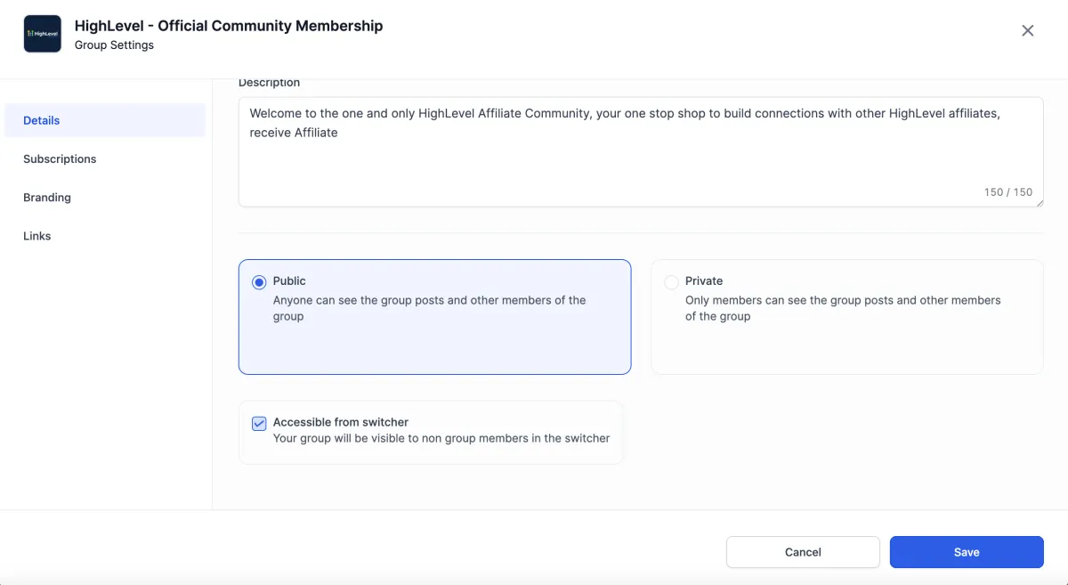 Über die Einstellungsschaltfläche können Administratoren und Eigentümer auswählen, ob sie ihre Gruppe als Öffentlich / Privat einrichten möchten.