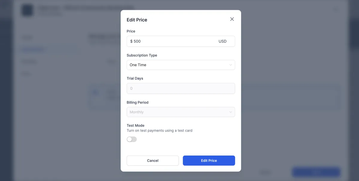 2. Klicken Sie auf "Neuen Preis hinzufügen": Geben Sie den Betrag, den Typ als Wiederkehrend, Probezeit (falls vorhanden), Abrechnungszeitraum als Monatlich oder Jährlich an