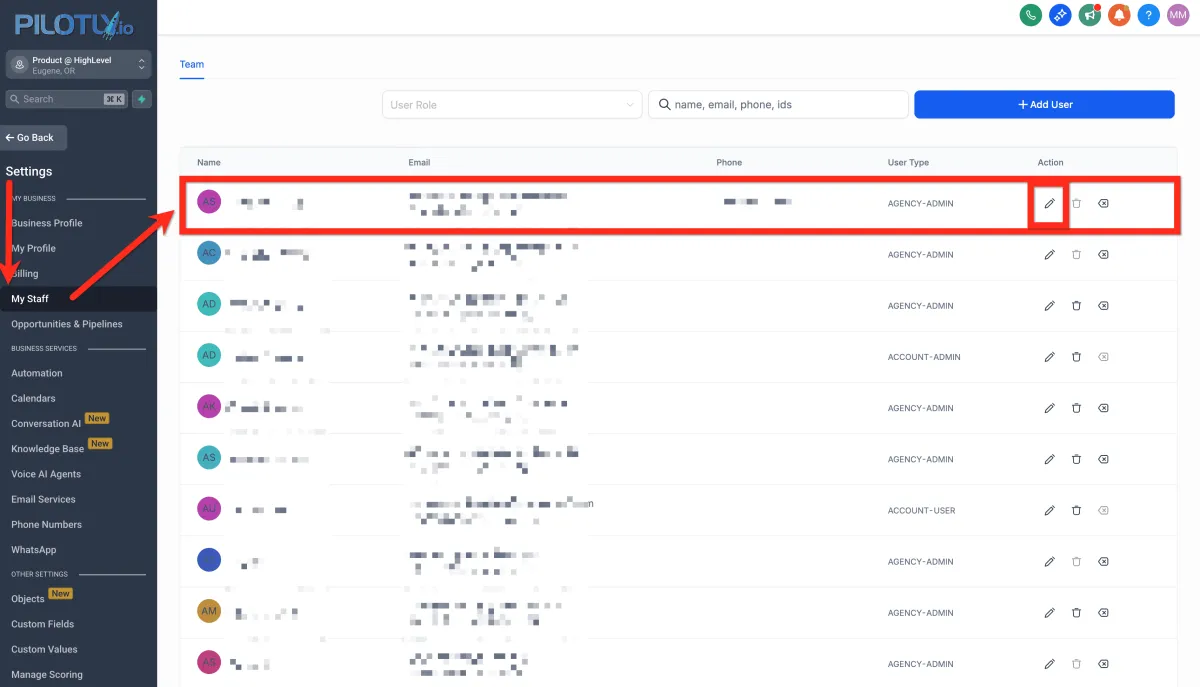 Navigieren Sie zu Unterkonto > Einstellungen > Meine Mitarbeiter > bestimmten Benutzer bearbeiten. Stellen Sie sicher, dass die Telefonnummer des Benutzers (die Nummer, die Sie anrufen, um mit ihm zu sprechen) nicht mit einer Pilotly.io-Nummer (die Nummer, die Sie von Pilotly.io erhalten haben) identisch ist.