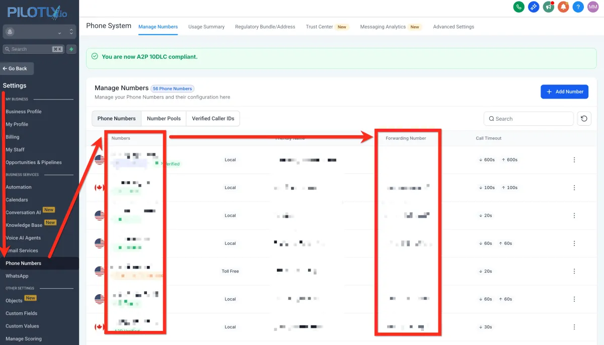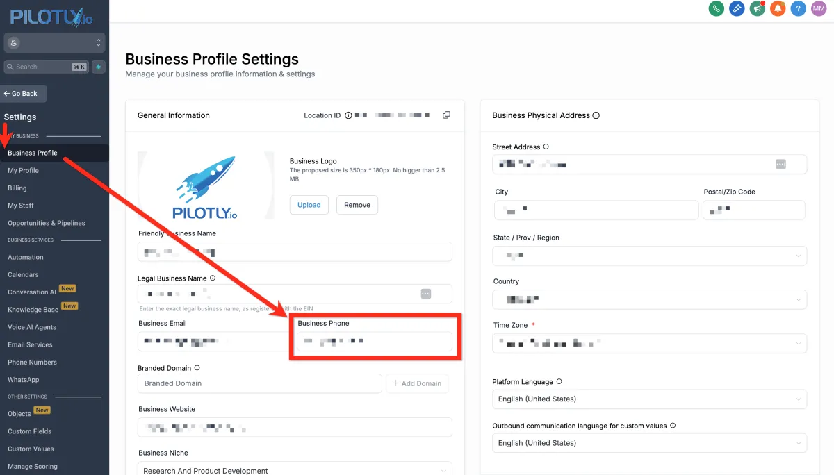 Überprüfen Sie auch Unterkonto > Einstellungen > Geschäftsprofil > Geschäftstelefon. Dies ist die Ausweichnummer, zu der der eingehende Anruf weitergeleitet wird. Überprüfen Sie dies, aber rufen Sie diese Nummer auch an, um zu sehen, ob sie trotzdem zur Pilotly.io-Nummer weitergeleitet wird. Es könnte wie eine andere Nummer aussehen, die dennoch so eingerichtet ist, dass sie zur Pilotly.io-Nummer weitergeleitet wird, also testen Sie es manuell.
