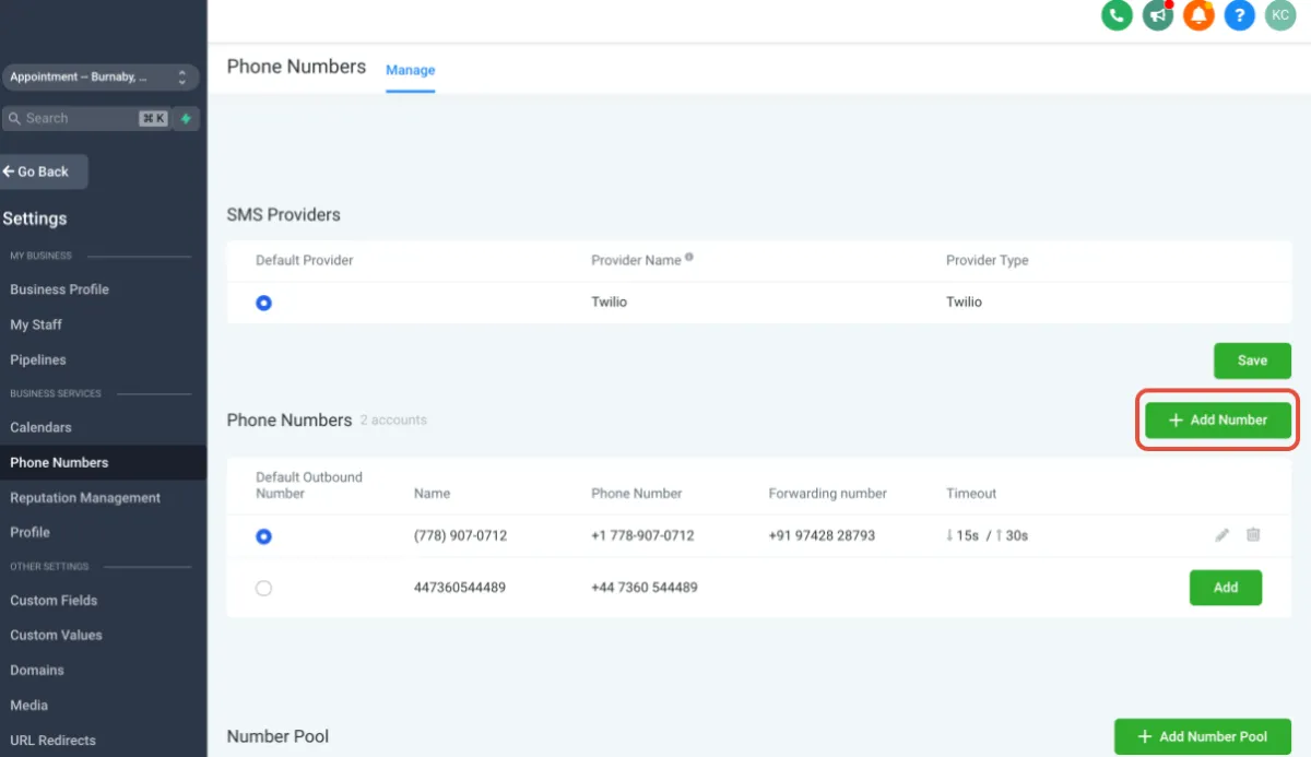 1. Gehe zu den Einstellungen > Telefonnummern > Klicke auf Nummer hinzufügen.