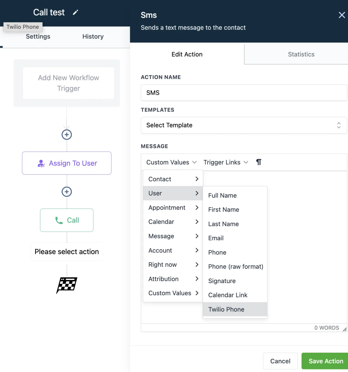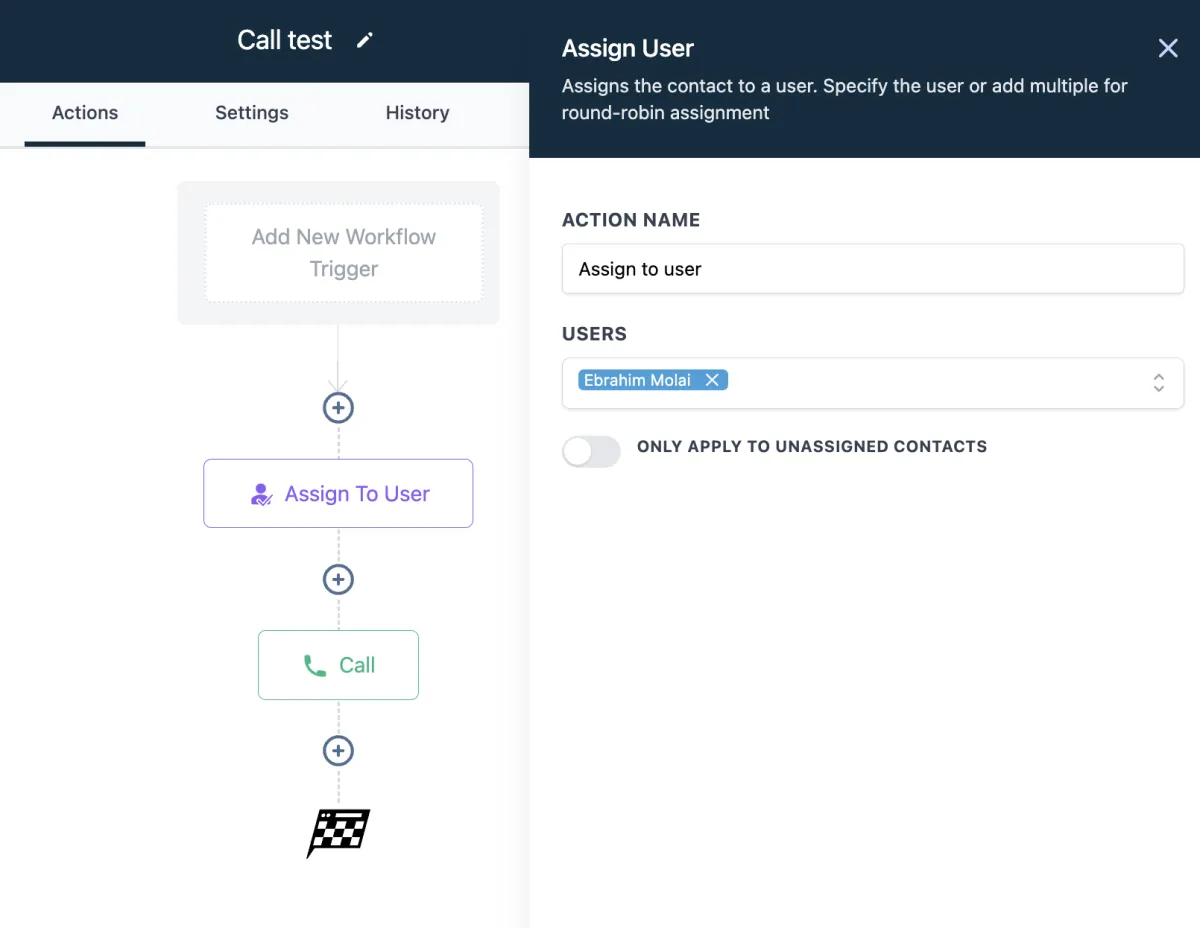 5. Um die zugewiesene Twilio-Nummer zur Initiierung von Anrufen und SMS zu verwenden, können wir eine Workflow-Aktion "Benutzer zuweisen" hinzufügen, damit der Kontakt dem Benutzer zugewiesen wird.