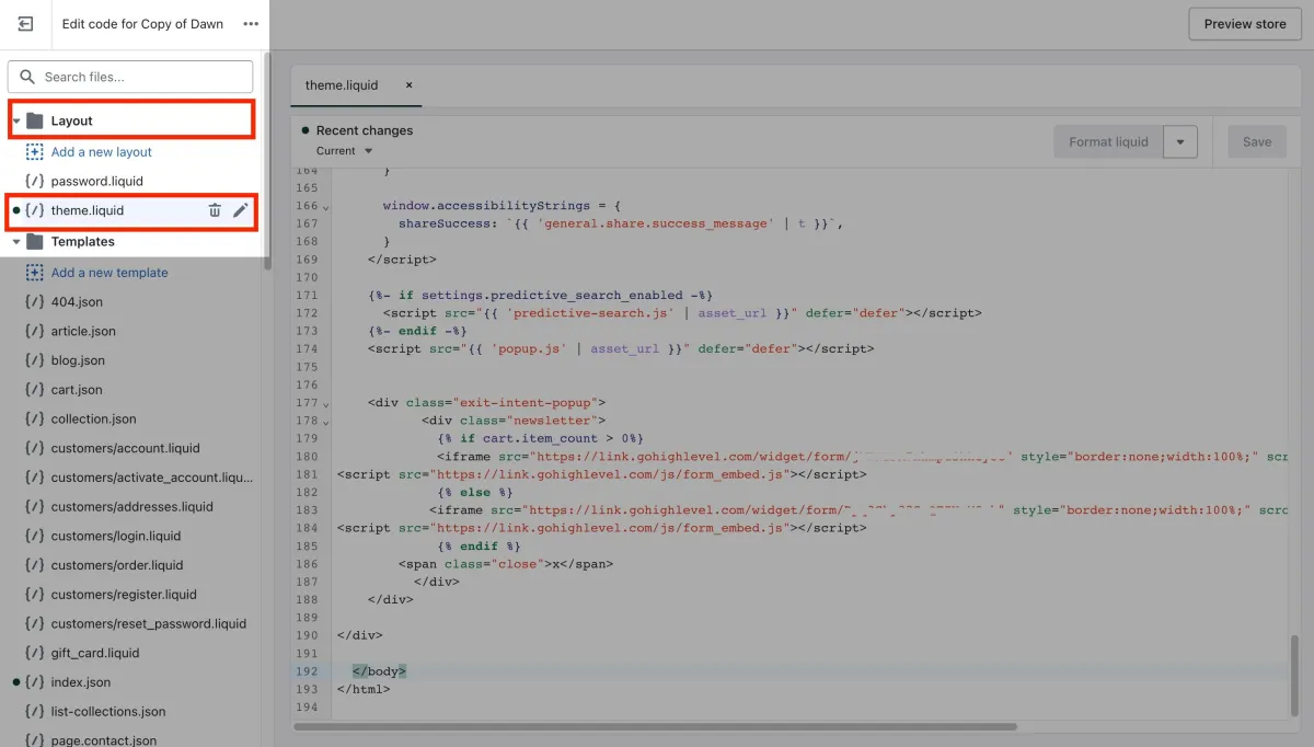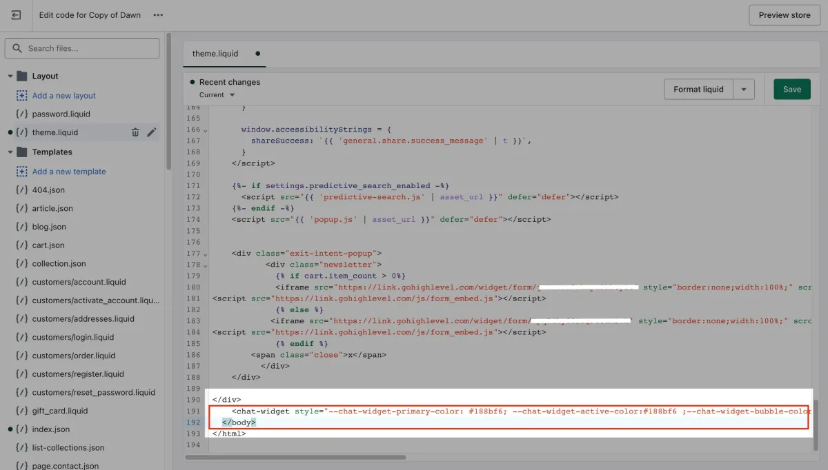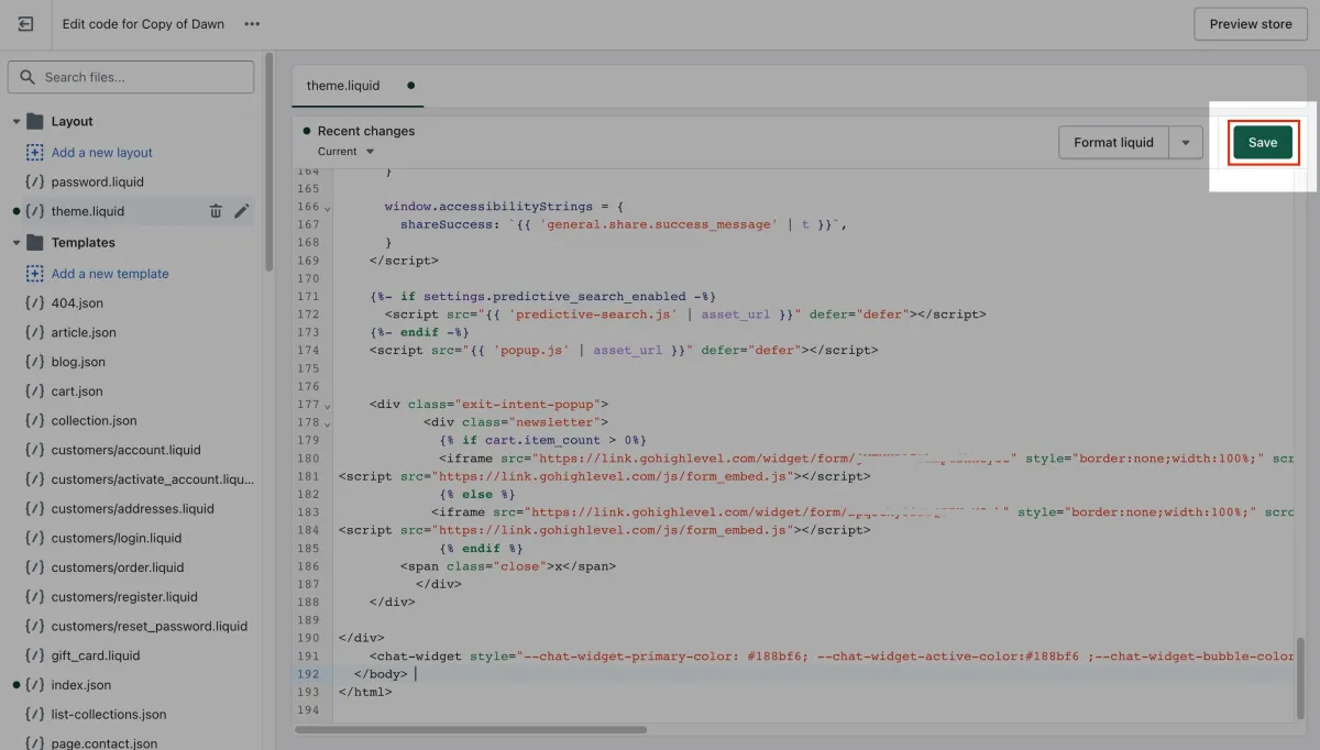 Fügen Sie den Einbettungscode ein: Suchen Sie nach dem </body>-Tag in der theme.liquid und fügen Sie den Einbettungscode darüber ein.