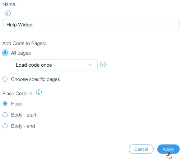 >Code zu Seiten hinzufügen: Wählen Sie "Alle Seiten" und wählen Sie "Code einmal laden"
