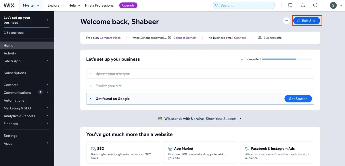 >Melden Sie sich bei Ihrem Wix-Konto an und navigieren Sie zum Dashboard der Website.