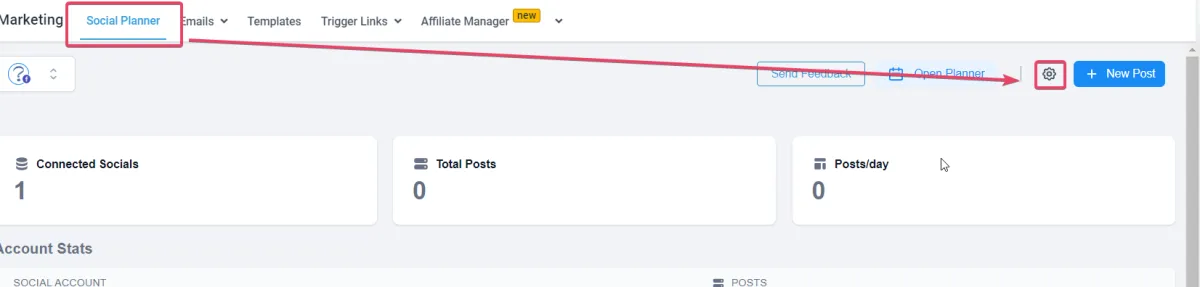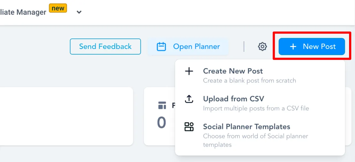 Navigieren Sie zu Marketing> Social Planner. Erstellen Sie einen neuen Beitrag, indem Sie auf den Button "Neuer Beitrag" klicken.