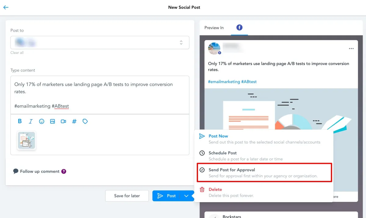 Social Planner bietet jetzt einen Beitragsgenehmigungsprozess, bei dem der Benutzer den Inhalt eines Social-Media-Beitrags von einem anderen Teammitglied überprüfen und analysieren lassen kann.