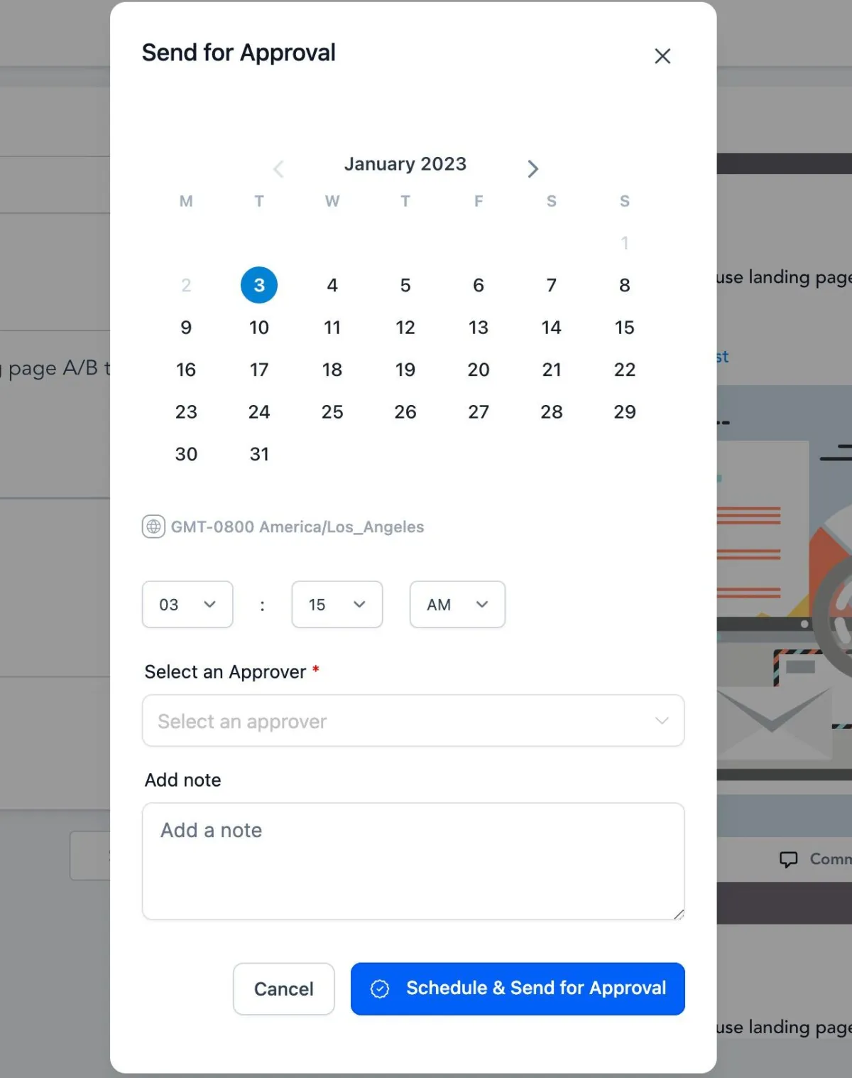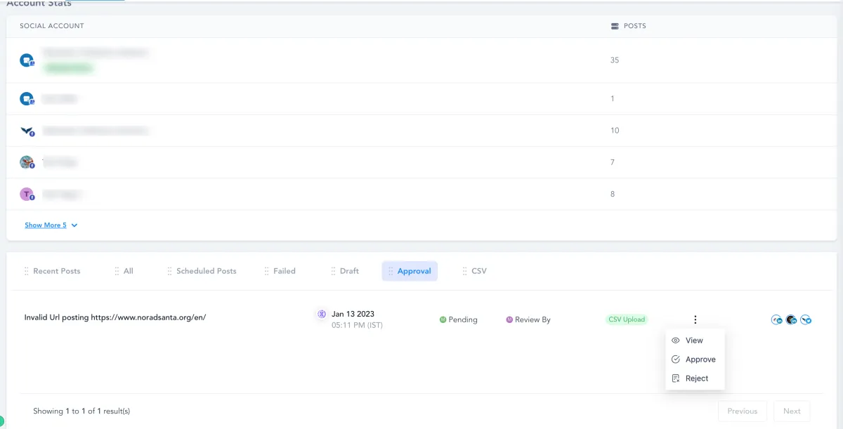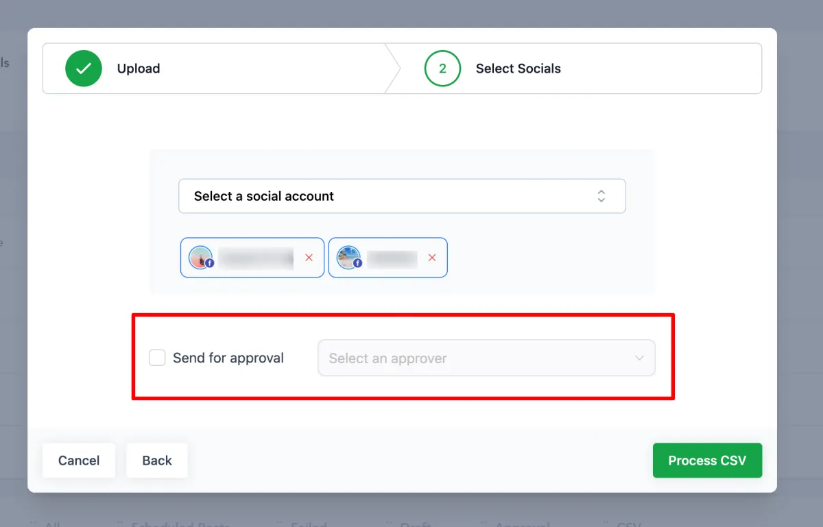 2. Sobald der Benutzer die CSV-Datei hinzugefügt und die sozialen Medien ausgewählt hat, gibt es eine Option, einen Genehmiger auszuwählen.