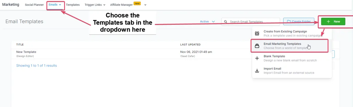 Benutzer können die E-Mail zur Genehmigung in den Einstellungen des Social Planners festlegen. Die E-Mail-Vorlage kann unter Marketing > E-Mails > Vorlagen > Neu > E-Mail-Marketingvorlagen gebrandet werden.