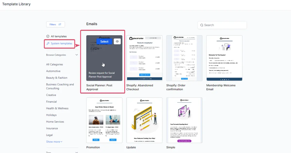 Sie werden dann zur Vorlagenbibliothek weitergeleitet, wo Sie zu Systemvorlagen > Sozialplaner: Post-Genehmigung navigieren und die Vorlage verwenden müssen. Sie können sie nach Belieben bearbeiten.